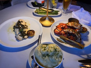 For entrées, the restaurant offers an impressive selection, especially from their renowned steakhouse. We chose the grilled branzino and the tender lobster tails, both cooked beautifully. The flavors were exquisite, and the seafood was cooked just right. We paired it with sides of asparagus and potato purée, both of which were fantastic and completed the meal.