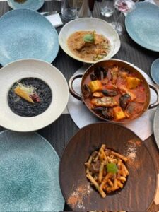 For the main courses, we savored the traditional black risotto with cuttlefish ink and parmesan chips; Dubrovnik capon stew inspired by a 16th-century recipe with figs, raisins, and sour orange marmalade; “Šporki makaruli,” a delicious cinnamon-scented beef pasta; and the royal seafood stew Brodet, bursting with fresh fish, seafood, olives, and capers in a rich tomato-wine sauce served over polenta.