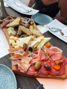 We began with a delightful trio of starters: a meat plate featuring Dalmatian smoked ham, pancetta, Slavonian kulen, and capon pâté; a Croatian cheese selection from small organic producers; and a seafood plate with marinated anchovies, shrimp pâté, smoked tuna, and mussels—all beautifully complemented by excellent homemade bread.