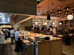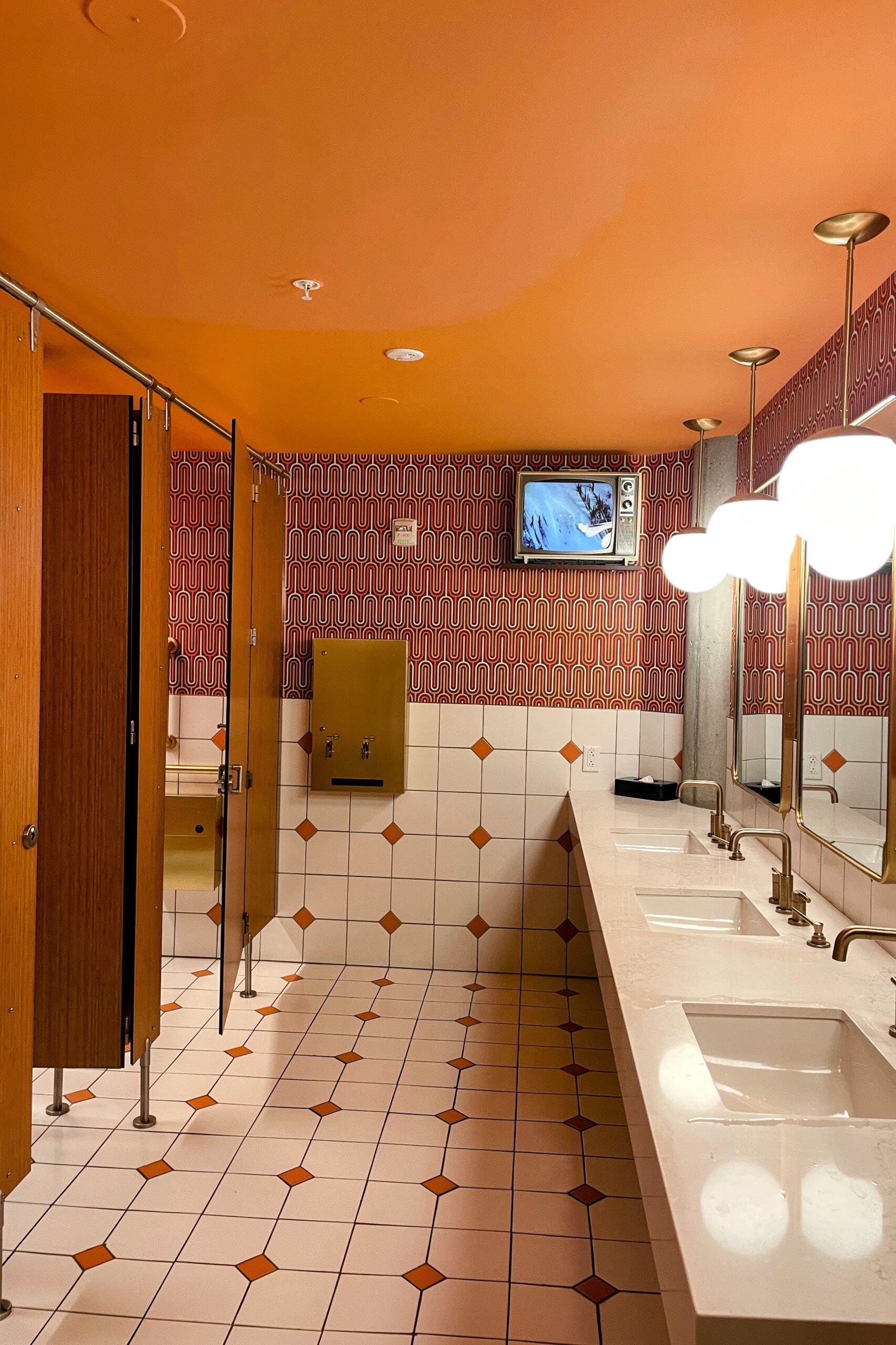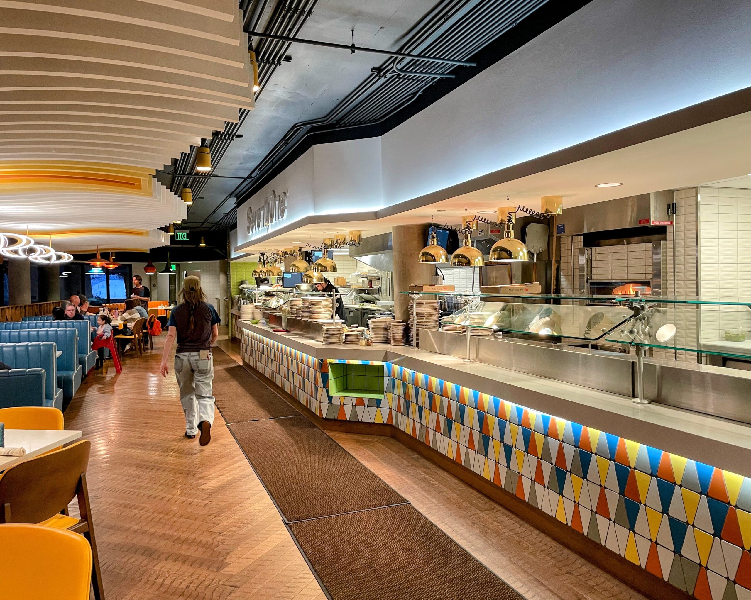 The restaurant’s name — SeventyOne — pays homage to the year Snowbird first opened, back in 1971, and the design leans into that era with a fun, vintage aesthetic. Think warm earth tones, retro patterns, and subtle nods to ’70s style throughout the dining space — a vibe that even extends into the bathroom (photo above) The décor gives the space a relaxed, joyful feel that’s both nostalgic and refreshing, contrasting pleasantly with the modern mountain views visible through large windows.