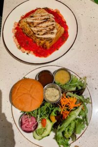 - The black bean burger came topped with juicy tomatoes and a creamy avocado sauce, paired beautifully with a crisp side salad — a satisfying choice even for non-vegans.