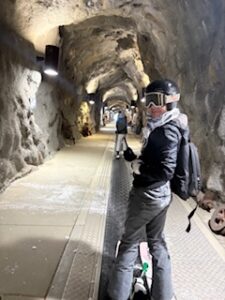 Instead of skiing down or riding a chairlift, skiers step onto the conveyor and glide slowly through the mountain.