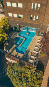 - The indoor/outdoor heated pool spills into the hot tub, so you literally swim from inside to outside — and it feels amazing.