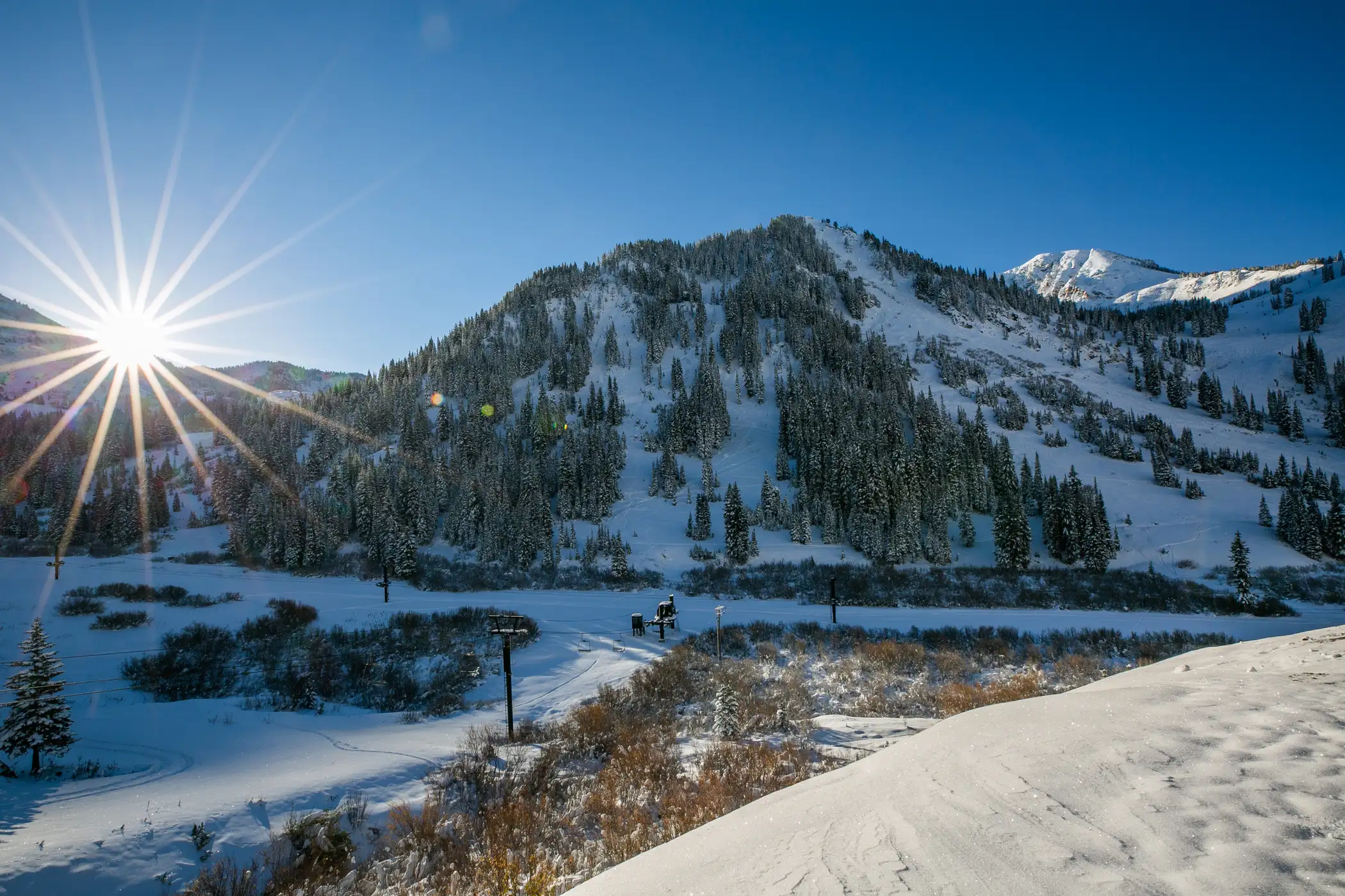 In total, Alta operates 5 main chairlifts and 2 covered conveyors, plus a handful of short chairlifts and tow ropes that provide access to three independently owned lodges. It’s a minimalist lift network serving massive terrain — and that’s exactly the point.